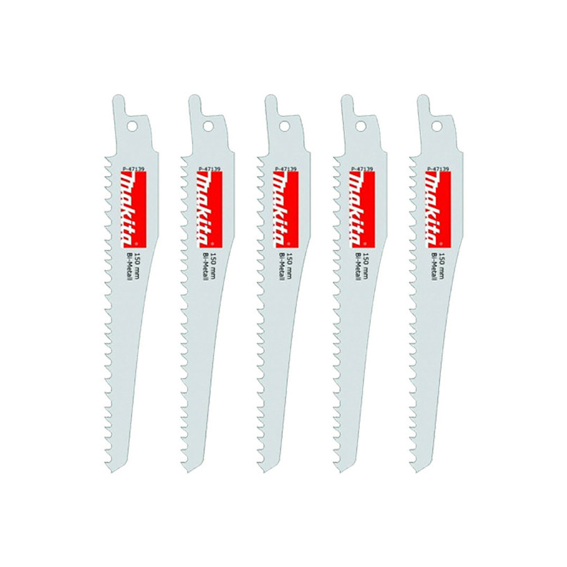 Makita P-47139 Recipro Blade 150mm 5-8TPI Demolition Bi-Metal – 5 Pack. Blades especially suitable for nails and screws. Suitable for Makita devices and also with other reciprocating saw brands.