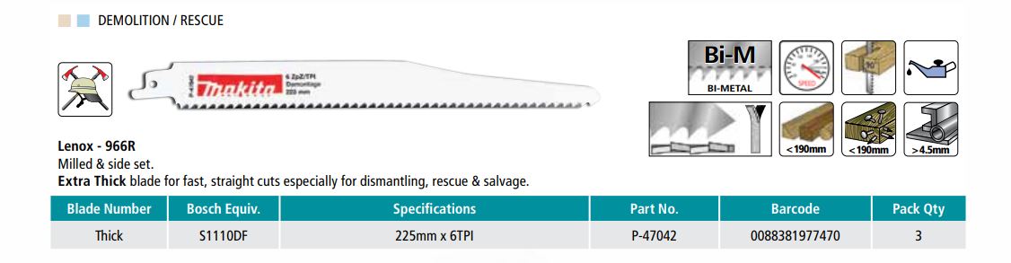 Makita Recipro Blade 225mm 6TPI Bi-Metal – 3 Pack P-47042. Features Milled & Side Set. Extra Thick blade for fast, straight cuts especially for dismantling, rescue & salvage.