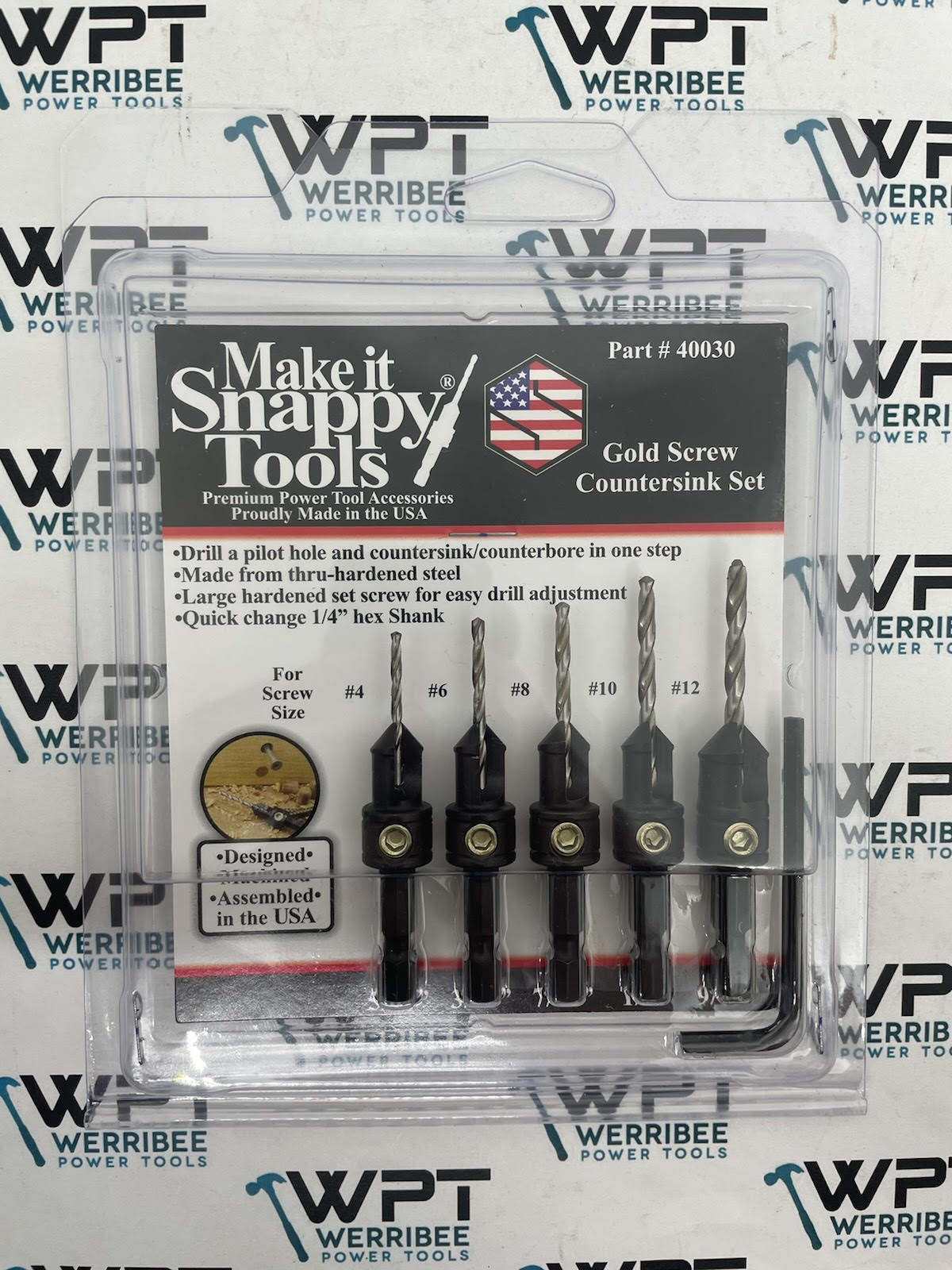 -(5) Gold Screw Countersinks: 5/64″x3/8″, 3/32″x3/8″, 7/64″x3/8″, 1/8″x3/8″ & 9/64″x1/2″